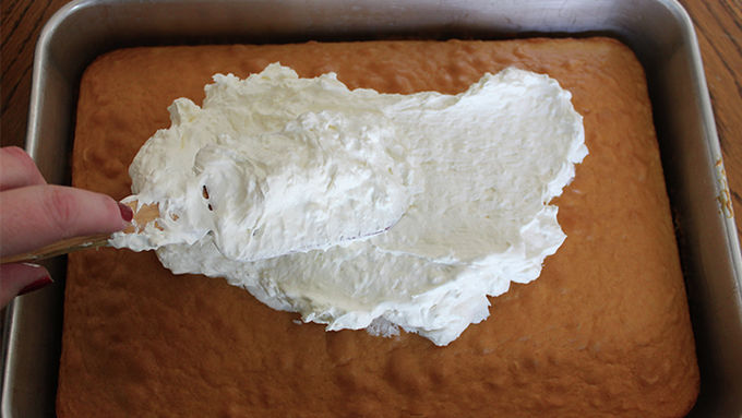 In large bowl, beat cream cheese and powdered sugar with electric mixer on medium speed until smooth. Fold in whipped topping. Spread evenly over cake.