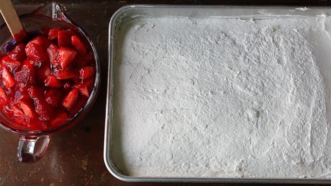 Instead of using strawberry glaze, try topping with macerated strawberries. This easy technique starts with slicing strawberries and mixing them with a few tablespoons of granulated sugar. Stir occasionally and you'll start to notice the berries releasing their juices. For best results, let stand at room temperature for up to 30 minutes. Top your strawberry shortcake sheet cake with the macerated berries and enjoy!